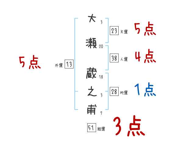 総運![]() | 大瀬蔵之甫さんの総運は51画の3つ星!変化が激しく、危険に注意。堅実な性格。 あなたの人生を表す1番重要な運勢です。生涯を通じて影響する総合運となり、主に50歳以降の晩年期に影響を及ぼします。 |