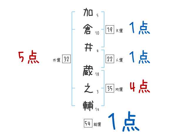 外運![]() | 加倉井蔵之輔さんの外運は32画の5つ星!柔軟性があり成功する。チャンスが多く金運が良い。 生活面を象徴する運勢です。外部から受ける影響力を表し、結婚運、家庭運や職場、環境への順応性を表します。 |