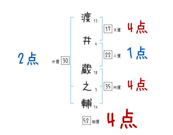 天運![]() | 渡井蔵之輔さんの天運は17画の4つ星!積極的な行動力。地位を気づき財産を手に入れる。純粋な心と直感力。 家系が持つ宿命的な運勢を表します。祖先から受け継いだ苗字ですので自分の力が及びません。家柄を象徴します。 |