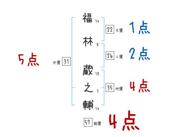 総運![]() | 福林蔵之輔さんの総運は57画の4つ星!向上心があり人望がある。地位を得る。 あなたの人生を表す1番重要な運勢です。生涯を通じて影響する総合運となり、主に50歳以降の晩年期に影響を及ぼします。 |