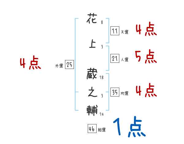 天運![]() | 花上蔵之輔さんの天運は11画の4つ星!着実に富や地位を得る幸運な人生。 家系が持つ宿命的な運勢を表します。祖先から受け継いだ苗字ですので自分の力が及びません。家柄を象徴します。 |