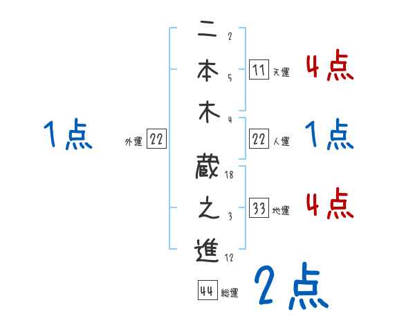 総運![]() | 二本木蔵之進さんの総運は44画の2つ星!誠実で慎重な性格。物事を考えすぎないように注意しましょう。 あなたの人生を表す1番重要な運勢です。生涯を通じて影響する総合運となり、主に50歳以降の晩年期に影響を及ぼします。 |