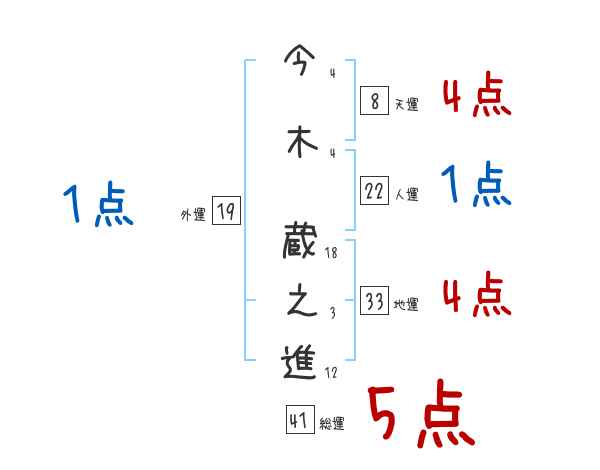 外運![]() | 今木蔵之進さんの外運は19画の1つ星!優れた才能を持ちますが、協調性が足りないことも。周りの人と協力する事を意識しましょう。 生活面を象徴する運勢です。外部から受ける影響力を表し、結婚運、家庭運や職場、環境への順応性を表します。 |