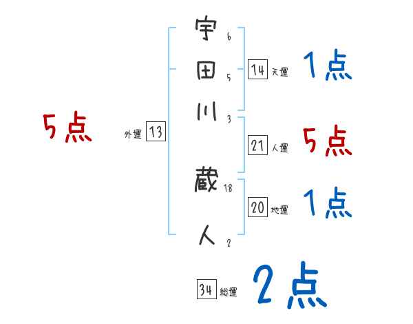 総運![]() | 宇田川蔵人さんの総運は34画の2つ星!独創性に優れるが、自尊心が強く災難に注意しましょう。 あなたの人生を表す1番重要な運勢です。生涯を通じて影響する総合運となり、主に50歳以降の晩年期に影響を及ぼします。 |