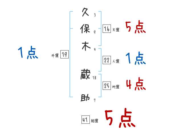 外運![]() | 久保木蔵助さんの外運は19画の1つ星!優れた才能を持ちますが、協調性が足りないことも。周りの人と協力する事を意識しましょう。 生活面を象徴する運勢です。外部から受ける影響力を表し、結婚運、家庭運や職場、環境への順応性を表します。 |