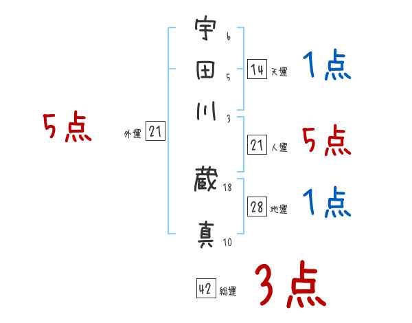 外運![]() | 宇田川蔵真さんの外運は21画の5つ星!統率力がある。独立し成功する。名誉を手に入れる。 生活面を象徴する運勢です。外部から受ける影響力を表し、結婚運、家庭運や職場、環境への順応性を表します。 |