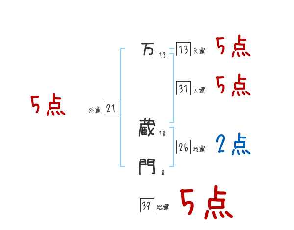 天運![]() | 万蔵門さんの天運は13画の5つ星!才能に恵まれ人気がある。名声を手に入れる。円満な人生。 家系が持つ宿命的な運勢を表します。祖先から受け継いだ苗字ですので自分の力が及びません。家柄を象徴します。 |