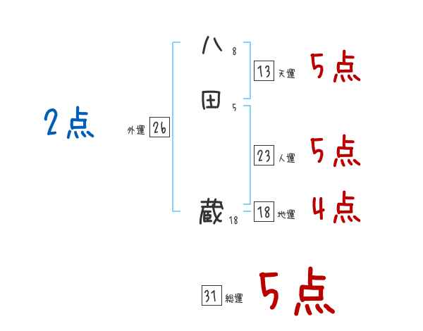 外運![]() | 八田蔵さんの外運は26画の2つ星!波瀾万丈かも。信頼できる人を大事にしましょう。 生活面を象徴する運勢です。外部から受ける影響力を表し、結婚運、家庭運や職場、環境への順応性を表します。 |