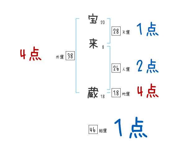 総運![]() | 宝来蔵さんの総運は46画の1つ星!迷走することが多く苦労するかも。目先のことにとらわれないように。 あなたの人生を表す1番重要な運勢です。生涯を通じて影響する総合運となり、主に50歳以降の晩年期に影響を及ぼします。 |