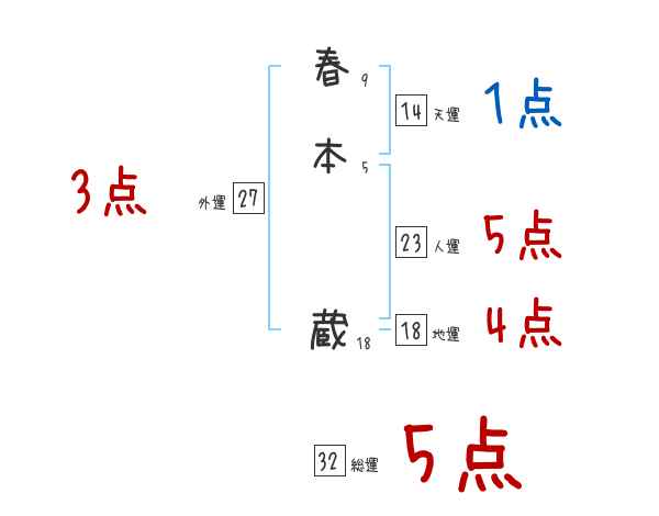 総運![]() | 春本蔵さんの総運は32画の5つ星!柔軟性があり成功する。チャンスが多く金運が良い。 あなたの人生を表す1番重要な運勢です。生涯を通じて影響する総合運となり、主に50歳以降の晩年期に影響を及ぼします。 |