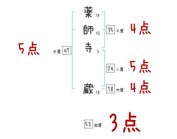 総運![]() | 薬師寺蔵さんの総運は53画の3つ星!やや見栄っ張りで虚栄心がある。散財に注意。 あなたの人生を表す1番重要な運勢です。生涯を通じて影響する総合運となり、主に50歳以降の晩年期に影響を及ぼします。 |