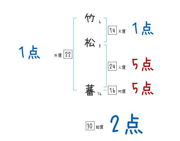 外運![]() | 竹松蕃さんの外運は22画の1つ星!努力することが苦手ないっぽう手先が器用。芸術性にも優れる。 生活面を象徴する運勢です。外部から受ける影響力を表し、結婚運、家庭運や職場、環境への順応性を表します。 |