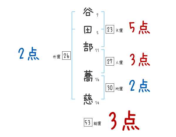 天運![]() | 谷田部蕎慈さんの天運は23画の5つ星!想像力に優れ活力がある。一代で成功し名誉を手に入れる。 家系が持つ宿命的な運勢を表します。祖先から受け継いだ苗字ですので自分の力が及びません。家柄を象徴します。 |