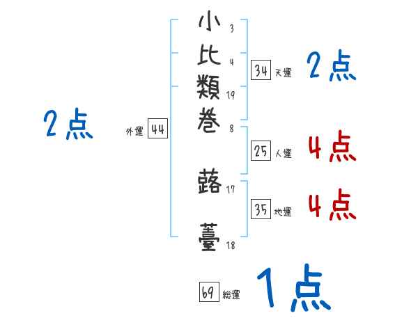 天運![]() | 小比類巻蕗薹さんの天運は34画の2つ星!独創性に優れるが、自尊心が強く災難に注意しましょう。 家系が持つ宿命的な運勢を表します。祖先から受け継いだ苗字ですので自分の力が及びません。家柄を象徴します。 |