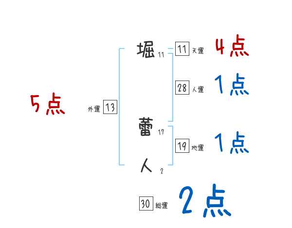 外運![]() | 堀蕾人さんの外運は13画の5つ星!才能に恵まれ人気がある。名声を手に入れる。円満な人生。 生活面を象徴する運勢です。外部から受ける影響力を表し、結婚運、家庭運や職場、環境への順応性を表します。 |