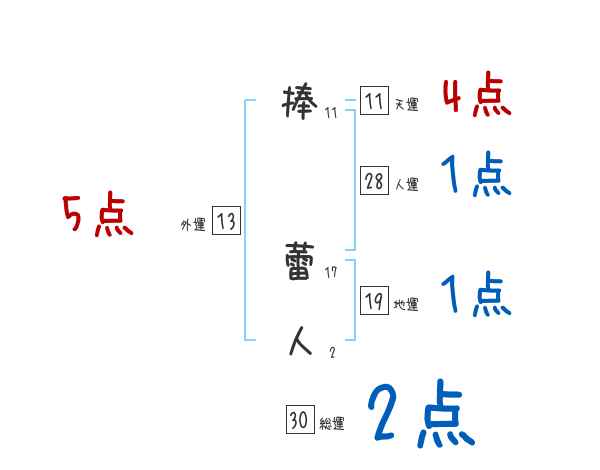 人運![]() | 捧蕾人さんの人運は28画の1つ星!家庭環境に注意。スポーツで活躍できる能力があるかも。 性格や才能などを表す2番目に重要な運勢です。人間関係や協調性、社会的な成功に影響します。主に20歳から50歳ぐらいまでの中年期の運勢を表します。 |