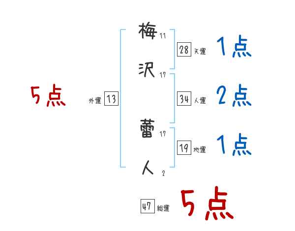 総運![]() | 梅沢蕾人さんの総運は47画の5つ星!実力が開花し発展する円満な人生。財に恵まれる。 あなたの人生を表す1番重要な運勢です。生涯を通じて影響する総合運となり、主に50歳以降の晩年期に影響を及ぼします。 |