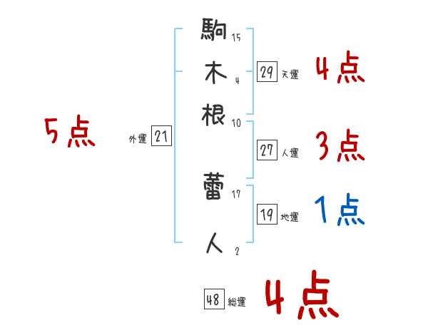 天運![]() | 駒木根蕾人さんの天運は29画の4つ星!完全主義で才能がある。厳格な心の持ち主。 家系が持つ宿命的な運勢を表します。祖先から受け継いだ苗字ですので自分の力が及びません。家柄を象徴します。 |