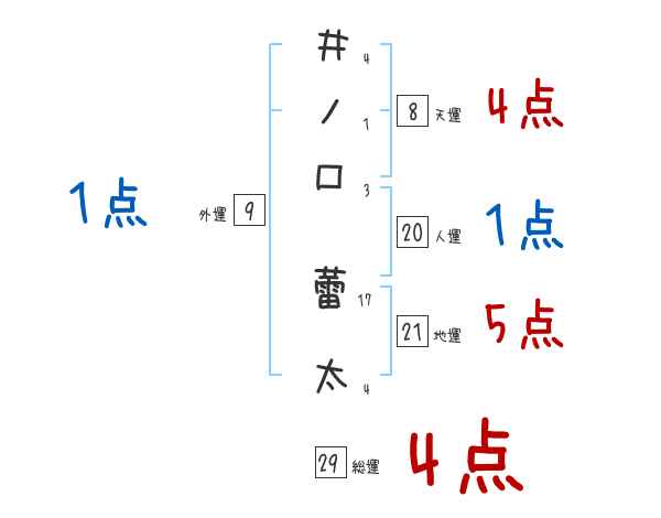 外運![]() | 井ノ口蕾太さんの外運は9画の1つ星!消極的で才能を発揮することが苦手なことも。周りの意見に耳を傾けましょう。 生活面を象徴する運勢です。外部から受ける影響力を表し、結婚運、家庭運や職場、環境への順応性を表します。 |