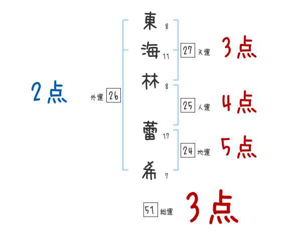 天運![]() | 東海林蕾希さんの天運は27画の3つ星!頭脳明晰だが強情で摩擦が多い傾向。孤立に注意。 家系が持つ宿命的な運勢を表します。祖先から受け継いだ苗字ですので自分の力が及びません。家柄を象徴します。 |