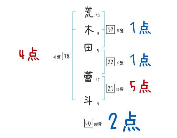 天運![]() | 荒木田蕾斗さんの天運は19画の1つ星!優れた才能を持ちますが、協調性が足りないことも。周りの人と協力する事を意識しましょう。 家系が持つ宿命的な運勢を表します。祖先から受け継いだ苗字ですので自分の力が及びません。家柄を象徴します。 |
