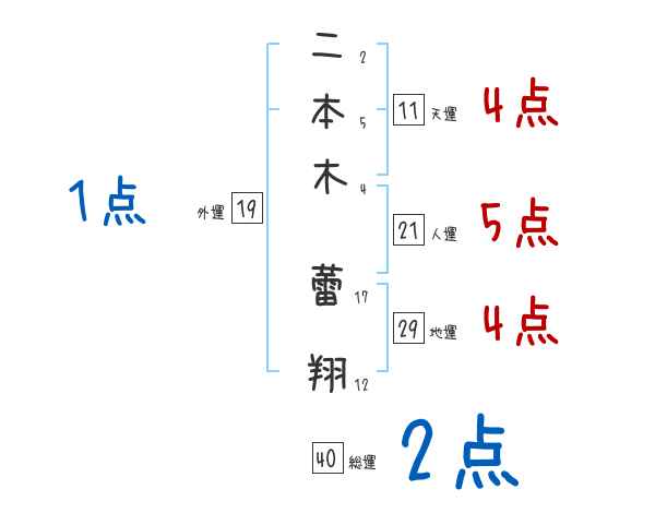天運![]() | 二本木蕾翔さんの天運は11画の4つ星!着実に富や地位を得る幸運な人生。 家系が持つ宿命的な運勢を表します。祖先から受け継いだ苗字ですので自分の力が及びません。家柄を象徴します。 |