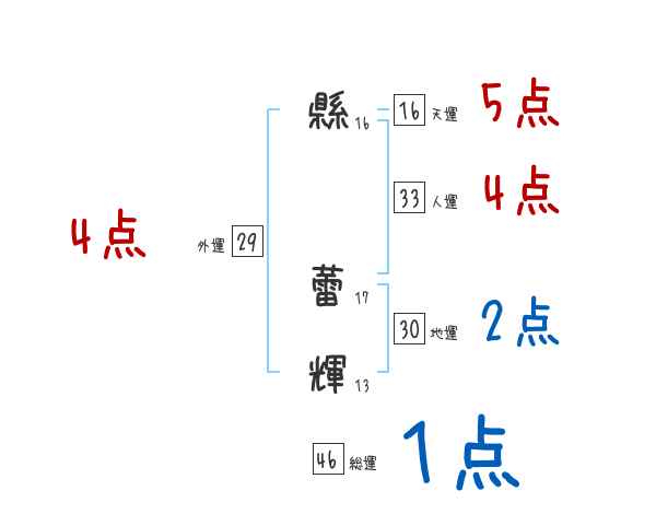 外運![]() | 縣蕾輝さんの外運は29画の4つ星!完全主義で才能がある。厳格な心の持ち主。 生活面を象徴する運勢です。外部から受ける影響力を表し、結婚運、家庭運や職場、環境への順応性を表します。 |