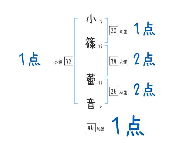 総運![]() | 小篠蕾音さんの総運は46画の1つ星!迷走することが多く苦労するかも。目先のことにとらわれないように。 あなたの人生を表す1番重要な運勢です。生涯を通じて影響する総合運となり、主に50歳以降の晩年期に影響を及ぼします。 |