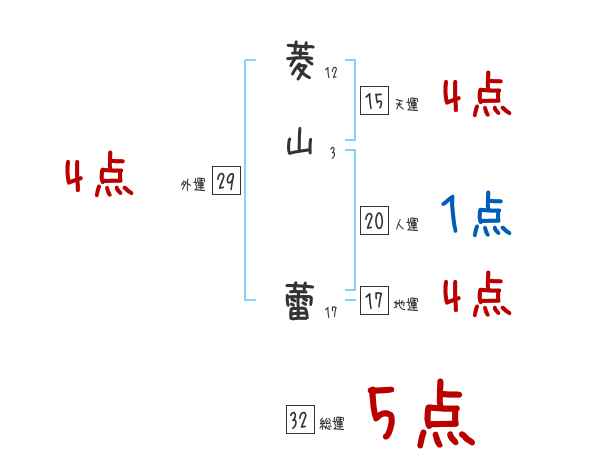 外運![]() | 菱山蕾さんの外運は29画の4つ星!完全主義で才能がある。厳格な心の持ち主。 生活面を象徴する運勢です。外部から受ける影響力を表し、結婚運、家庭運や職場、環境への順応性を表します。 |