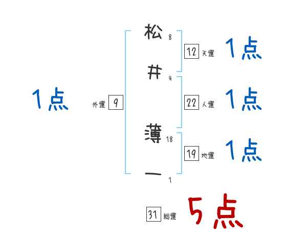 総運![]() | 松井薄一さんの総運は31画の5つ星!社交性があり判断力に優れる。順風満帆な人生で円満な生活。 あなたの人生を表す1番重要な運勢です。生涯を通じて影響する総合運となり、主に50歳以降の晩年期に影響を及ぼします。 |