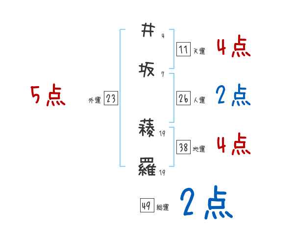天運![]() | 井坂薐羅さんの天運は11画の4つ星!着実に富や地位を得る幸運な人生。 家系が持つ宿命的な運勢を表します。祖先から受け継いだ苗字ですので自分の力が及びません。家柄を象徴します。 |