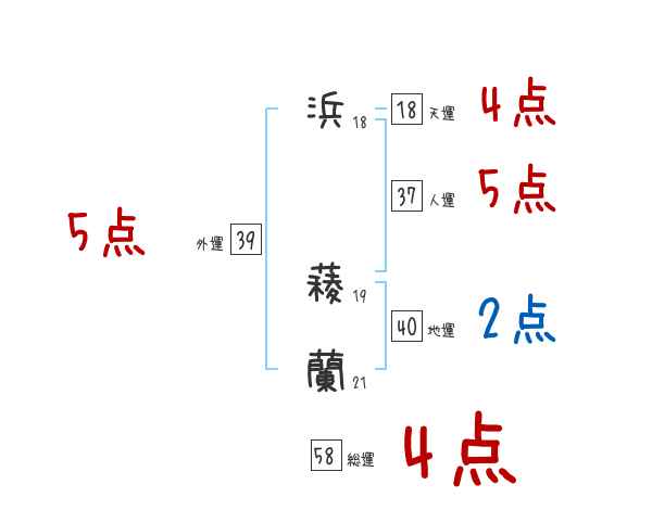 外運![]() | 浜薐蘭さんの外運は39画の5つ星!社交性に優れ人望が厚い。人の上に立ち成功する。 生活面を象徴する運勢です。外部から受ける影響力を表し、結婚運、家庭運や職場、環境への順応性を表します。 |