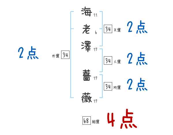 総運![]() | 海老澤薔薇さんの総運は68画の4つ星!潜在能力が高く集中力が高い。勤勉に励み発展する。 あなたの人生を表す1番重要な運勢です。生涯を通じて影響する総合運となり、主に50歳以降の晩年期に影響を及ぼします。 |