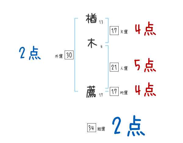 総運![]() | 楢木薦さんの総運は34画の2つ星!独創性に優れるが、自尊心が強く災難に注意しましょう。 あなたの人生を表す1番重要な運勢です。生涯を通じて影響する総合運となり、主に50歳以降の晩年期に影響を及ぼします。 |