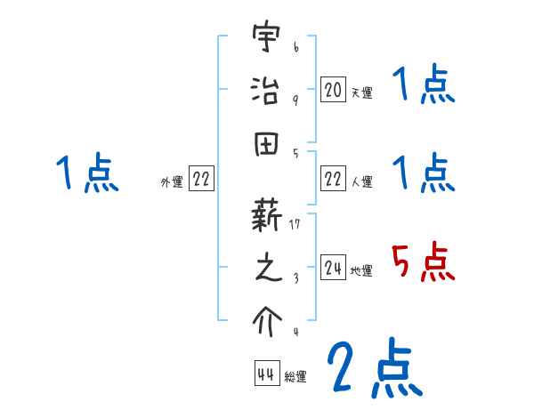 総運![]() | 宇治田薪之介さんの総運は44画の2つ星!誠実で慎重な性格。物事を考えすぎないように注意しましょう。 あなたの人生を表す1番重要な運勢です。生涯を通じて影響する総合運となり、主に50歳以降の晩年期に影響を及ぼします。 |