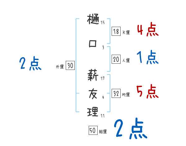 天運![]() | 樋口薪友理さんの天運は18画の4つ星!情熱的で剛気。忍耐力があり信頼される。 家系が持つ宿命的な運勢を表します。祖先から受け継いだ苗字ですので自分の力が及びません。家柄を象徴します。 |