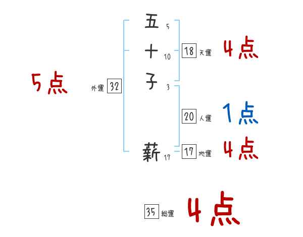 外運![]() | 五十子薪さんの外運は32画の5つ星!柔軟性があり成功する。チャンスが多く金運が良い。 生活面を象徴する運勢です。外部から受ける影響力を表し、結婚運、家庭運や職場、環境への順応性を表します。 |