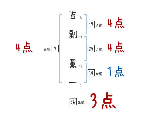 総運![]() | 吉副薫一さんの総運は36画の3つ星!先見性が豊かです。多少神経質で苦労することも。 あなたの人生を表す1番重要な運勢です。生涯を通じて影響する総合運となり、主に50歳以降の晩年期に影響を及ぼします。 |