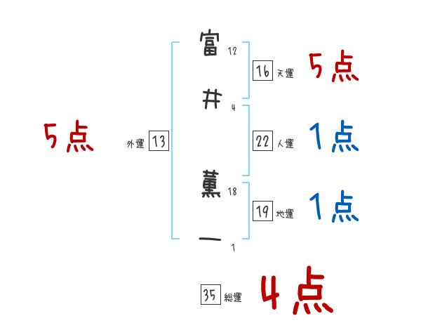 天運![]() | 富井薫一さんの天運は16画の5つ星!人望が厚く大きく発展する。逆転成功が見える。 家系が持つ宿命的な運勢を表します。祖先から受け継いだ苗字ですので自分の力が及びません。家柄を象徴します。 |