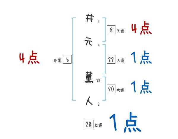 総運![]() | 井元薫人さんの総運は28画の1つ星!家庭環境に注意。スポーツで活躍できる能力があるかも。 あなたの人生を表す1番重要な運勢です。生涯を通じて影響する総合運となり、主に50歳以降の晩年期に影響を及ぼします。 |
