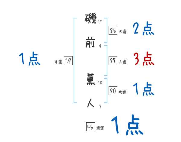 外運![]() | 磯前薫人さんの外運は19画の1つ星!優れた才能を持ちますが、協調性が足りないことも。周りの人と協力する事を意識しましょう。 生活面を象徴する運勢です。外部から受ける影響力を表し、結婚運、家庭運や職場、環境への順応性を表します。 |