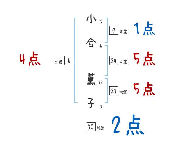 天運![]() | 小合薫子さんの天運は9画の1つ星!消極的で才能を発揮することが苦手なことも。周りの意見に耳を傾けましょう。 家系が持つ宿命的な運勢を表します。祖先から受け継いだ苗字ですので自分の力が及びません。家柄を象徴します。 |