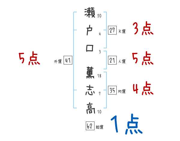 人運![]() | 瀬戸口薫志高さんの人運は21画の5つ星!統率力がある。独立し成功する。名誉を手に入れる。 性格や才能などを表す2番目に重要な運勢です。人間関係や協調性、社会的な成功に影響します。主に20歳から50歳ぐらいまでの中年期の運勢を表します。 |