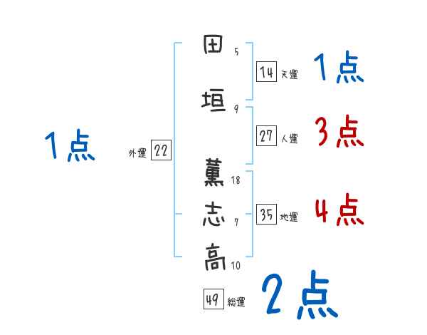 天運![]() | 田垣薫志高さんの天運は14画の1つ星!人に対して優しいがストレスを溜め込みがち。人間関係のトラブルを避けるよう気をつけましょう。 家系が持つ宿命的な運勢を表します。祖先から受け継いだ苗字ですので自分の力が及びません。家柄を象徴します。 |