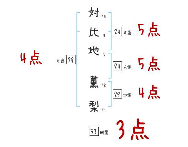 外運![]() | 対比地薫梨さんの外運は29画の4つ星!完全主義で才能がある。厳格な心の持ち主。 生活面を象徴する運勢です。外部から受ける影響力を表し、結婚運、家庭運や職場、環境への順応性を表します。 |