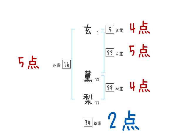 天運![]() | 玄薫梨さんの天運は5画の4つ星!健康で安泰。協調性に優れ、財産に恵まれる。 家系が持つ宿命的な運勢を表します。祖先から受け継いだ苗字ですので自分の力が及びません。家柄を象徴します。 |
