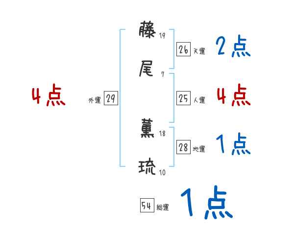 外運![]() | 藤尾薫琉さんの外運は29画の4つ星!完全主義で才能がある。厳格な心の持ち主。 生活面を象徴する運勢です。外部から受ける影響力を表し、結婚運、家庭運や職場、環境への順応性を表します。 |