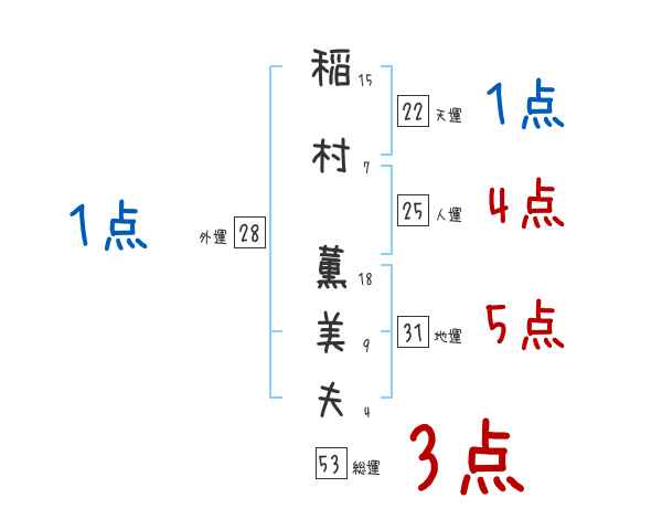 外運![]() | 稲村薫美夫さんの外運は28画の1つ星!家庭環境に注意。スポーツで活躍できる能力があるかも。 生活面を象徴する運勢です。外部から受ける影響力を表し、結婚運、家庭運や職場、環境への順応性を表します。 |