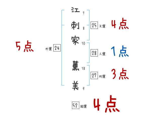 総運![]() | 江刺家薫美さんの総運は52画の4つ星!先見性と独創性に優れ考える力がある。強運の持ち主。 あなたの人生を表す1番重要な運勢です。生涯を通じて影響する総合運となり、主に50歳以降の晩年期に影響を及ぼします。 |
