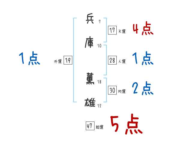 人運![]() | 兵庫薫雄さんの人運は28画の1つ星!家庭環境に注意。スポーツで活躍できる能力があるかも。 性格や才能などを表す2番目に重要な運勢です。人間関係や協調性、社会的な成功に影響します。主に20歳から50歳ぐらいまでの中年期の運勢を表します。 |
